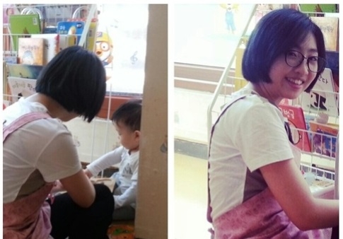 In the picture, Minzy is wearing black horn-rimmed glasses and a casual white t-shirt with an apron unlike her usual charismatic outfit on stage. Her gentle smile is drawing attention with her natural look as she is spending time with the children.