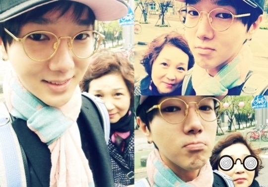On April 29, Yesung uploaded two photos on his Twitter and wrote, "The weather has suddenly become cold. Today, I open with mother. I put a glasses sticker on a picture with her eyes closed."