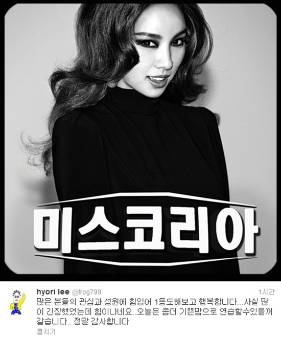 On May 6, Lee Hyori expressed her gratitude towards her fans on Twitter, "I'm so happy because I scored #1 thanks to many of your interest and support. To be honest, I was really nervous but I've gained strength. Today, I will be able to practice a little happier. Thank you so much."