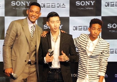 On May 7, Hollywood's star actor Will Smith and his son Jaden Smith attended the red carpet event for their upcoming movie 'After Earth', held at the Seoul Time Square Atrium. Singer Jay Park came out as a special guest and posed on stage with both Will and Jaden Smith.