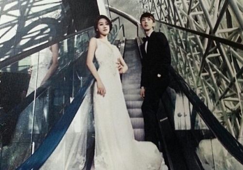 In the picture, Oh Seung-Ah is wearing a tight white wedding dress showing off her S line while Jo Kwon is in a black neat tuxedo.
