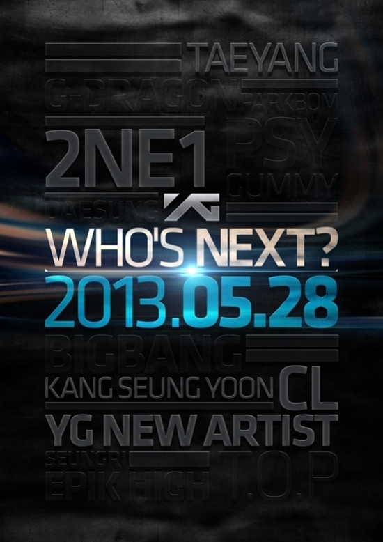On May 8, the agency has narrowed down the list by fading out some of the candidates on the poster, leaving just Taeyang, 2NE1, Kang Seung-Yoon, CL, and YG New Artist, raising the level of anticipation for a new comeback or a new debut.