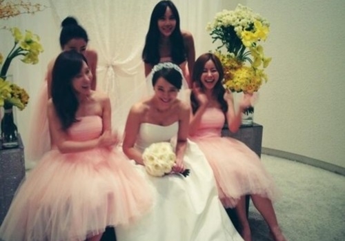 Her best friends including Lee Ji-Hye and Yuri are smiling in pink colored tube-top dresses and surrounding the bride as her bridesmaids.