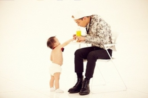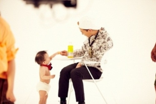 On June 7, Glaceau Vitamin Water released the behind-the-scenes photos of Big Bang's G-Dragon on the commercial set. In the photos, G-Dragon is completely in love with the baby G-Dragon wearing a bowtie.