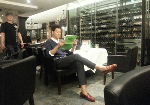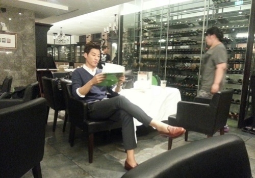 In the photos, Lee Chun-Hee is reading a script on a chair during his break. What's the most eye-catching is his incredibly long, slender legs.