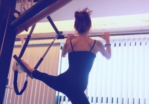 In the photo, the actress is showing her back while stretching on a fitness equipment. She is showing off her incredible flexibility by lifting her leg up high in the air like a gymnast.