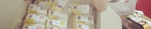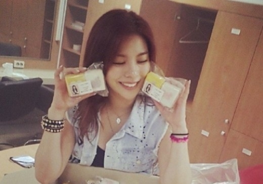In the photo, the singer is holding the 500th day celebrating rice cakes in both hands as she is smiling at the camera.