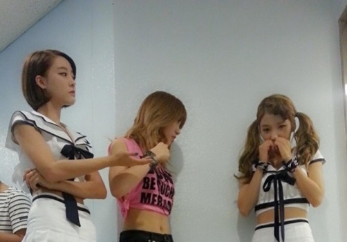 In the photo, Go Woori and Lizzy have transformed into bad girls and threatening Rainbow's Jisook with scary faces. Jisook looks scared.