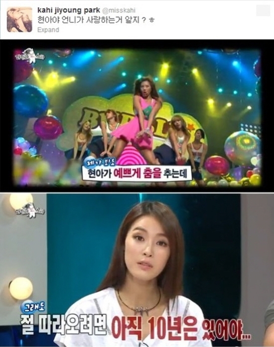 After the broadcast, Kahi left a mention on Twitter, "HyunA, you know that I love you, right?" It seems like Kahi was a bit worried that she would look like criticizing HyunA.