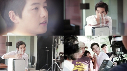 A video showcasing the making of the commercial features Song Joong-Ki working hard for the commercial for the national brand of water purifier. In the video, he is carefully monitoring his own acting, showing that he is very committed actor.