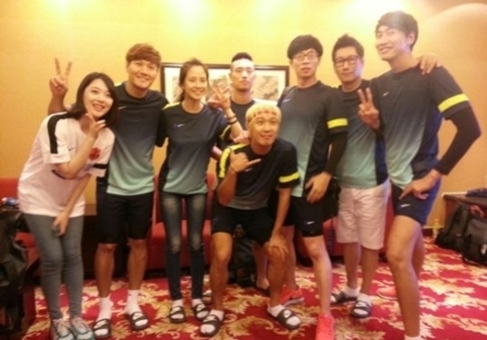 In the photo, the 'Running man' members Yoo Jae-Suk, Ji Suk-Jin, Lee Kwang-Soo, Kim Jong-Guk, Song Ji-Hyo, HaHa, Gary, and f(x) member Sulli are posing friendly.