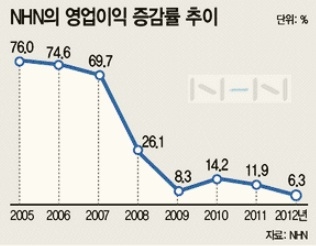NHN's operating profit rocketed 76 percent in 2005, 74.6 percent in 2006, and 69.7 percent in 2007. However its profit dropped 8.3 percent in 2009, 14.2 percent in 2010, 11.9 percent in 2011, and 6.3 percent in 2012.